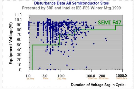 下圖是SEMI 標(biāo)委會(huì)組織的電能質(zhì)量專題小組調(diào)研結(jié)果,經(jīng)過兩次在全美洲22 站點(diǎn)進(jìn)行電能質(zhì)量研究,共記錄到1076 個(gè)電壓暫降事件,其中在綠色線(SEMI 標(biāo)準(zhǔn))上方的電壓暫降的數(shù)量占總數(shù)的93%,僅有6 個(gè)事件為斷電且都在1 秒以內(nèi),僅有3 個(gè)事件在2 秒以外。