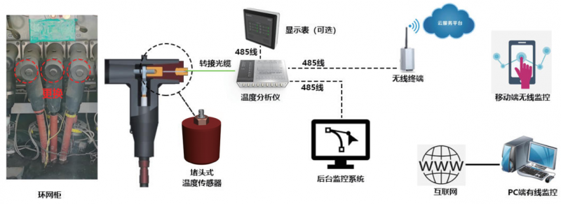 ? 光纖溫度傳感器內置于T型接頭的絕緣塞內,光纖傳感器直接與堵頭尾部的金屬件接觸,實時監測T型接頭內部的溫度情況。